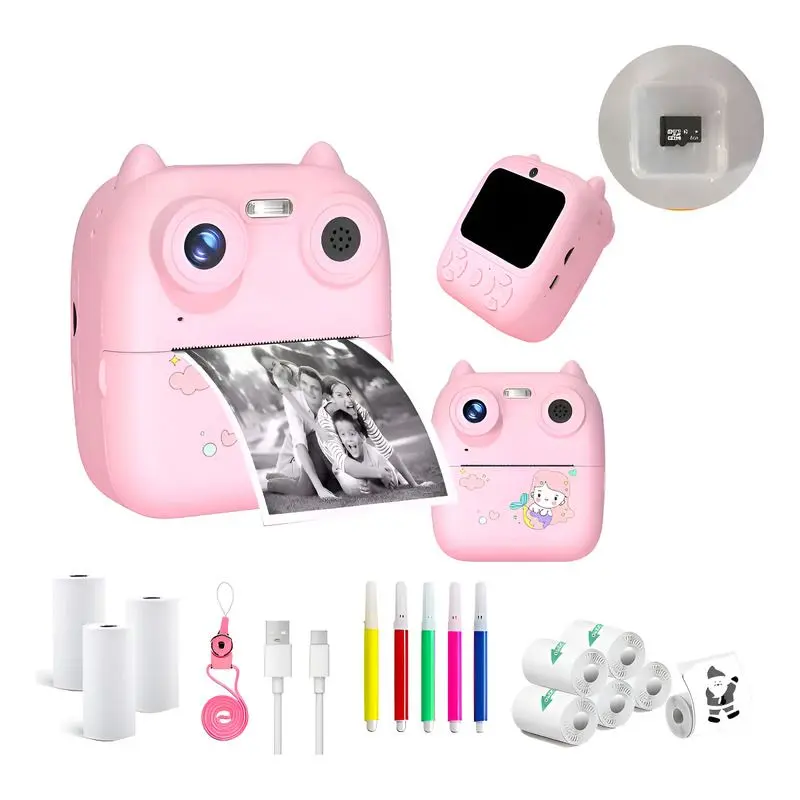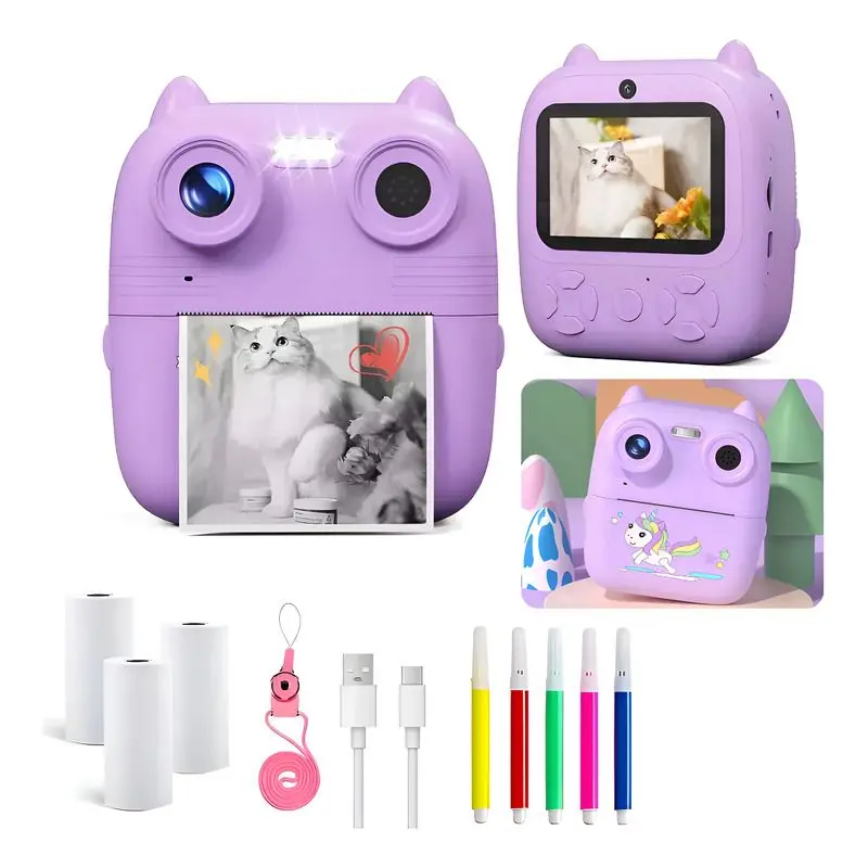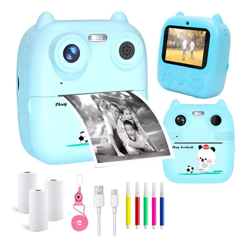 1 cámara de impresión para niños con 10 cm de alto x 9,5 cm de ancho X 4 cm de profundidad, 3 rollos de papel de impresión, kit con marcadores, 1 cable de carga, 1 correa para el cuello y 1 manual de usuario.